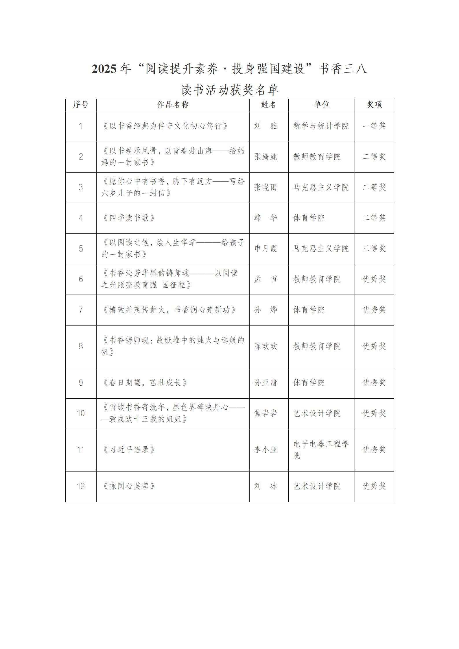 2025年5月-9月,河南省教科文卫体工会在全系统女职工中开展了关于“阅读提升素养·投身强国建设”为主题的书香三八读书活动。活动开展以来,校工会高度重视、精心组织、广泛宣传,广大女职工积极响应、热情参与,最终取得一等奖1名,二等奖3名,三等奖1名,优秀奖7名的优异成绩。